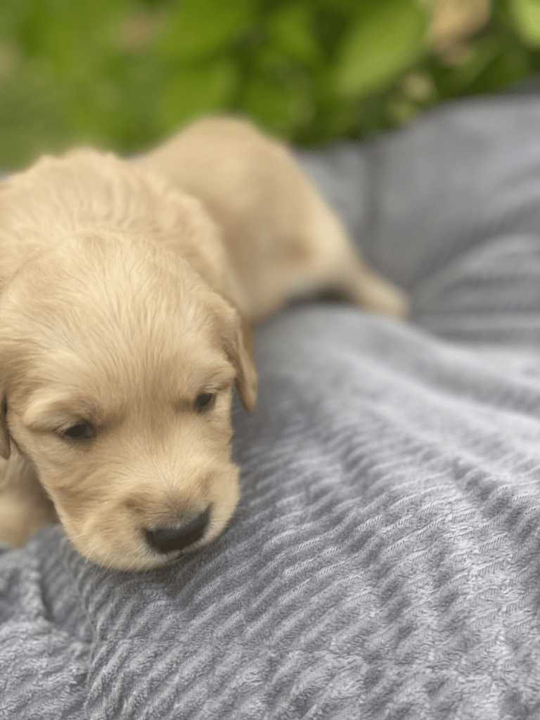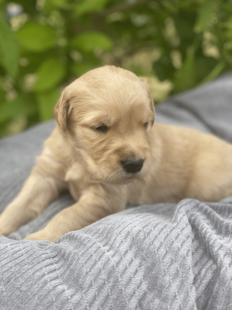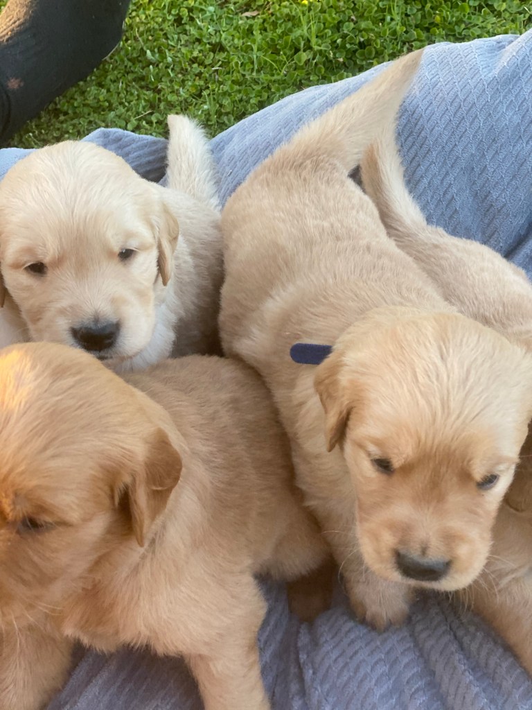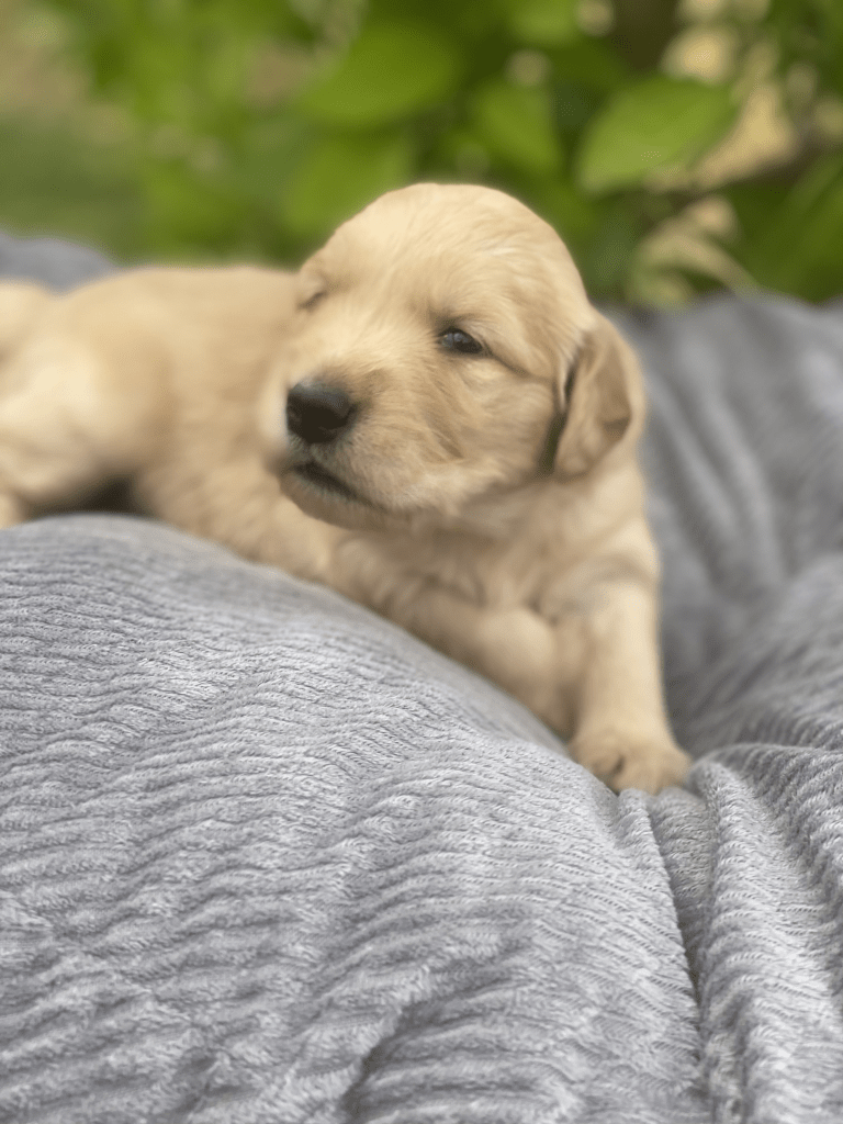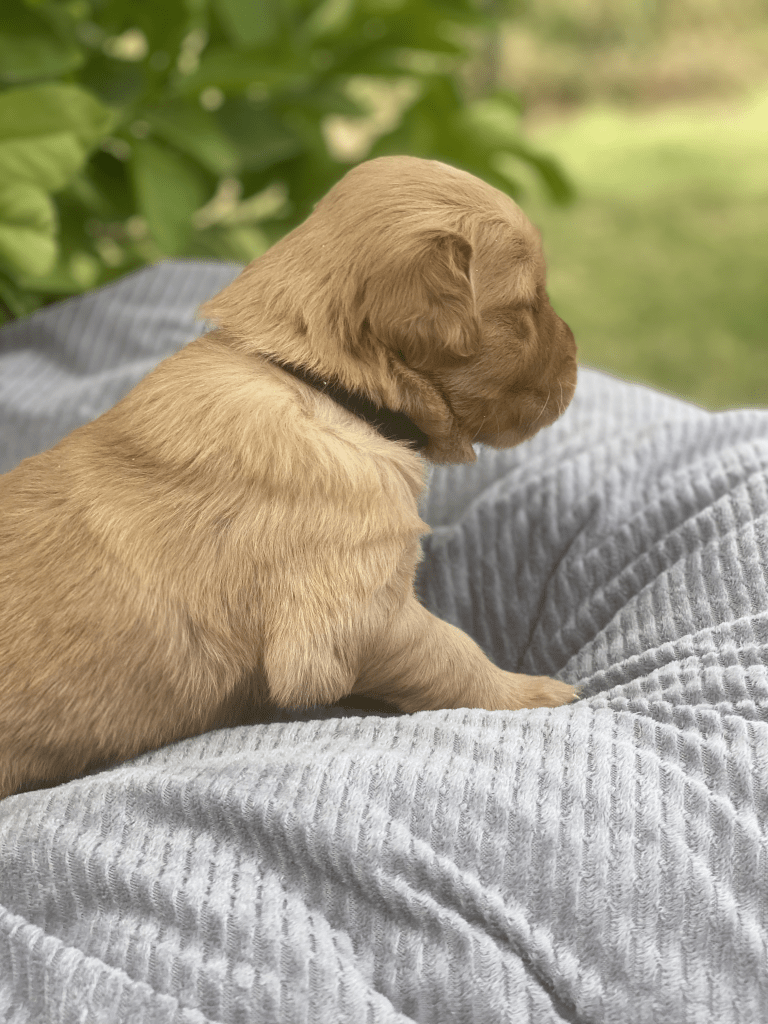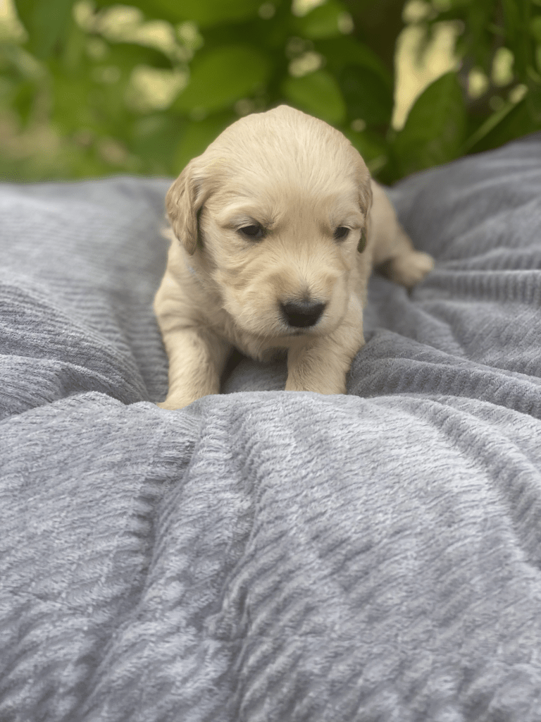 Pups are starting to get big, starting to show more color (Golden Puppies will usually match the color of their ears when they fully mature), and their eyes are just starting to open. Personalities are starting to show more (talking a lot more), and they are learning to walk. All very exciting, and on track for their development.