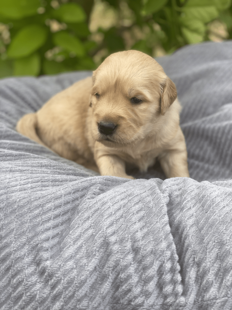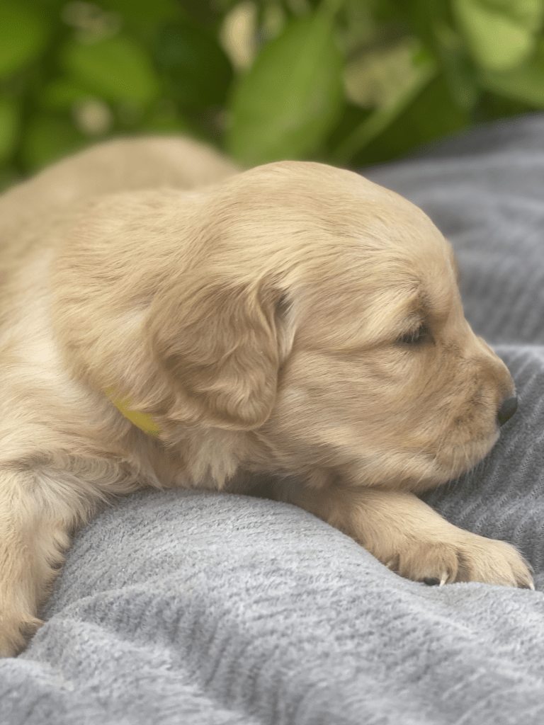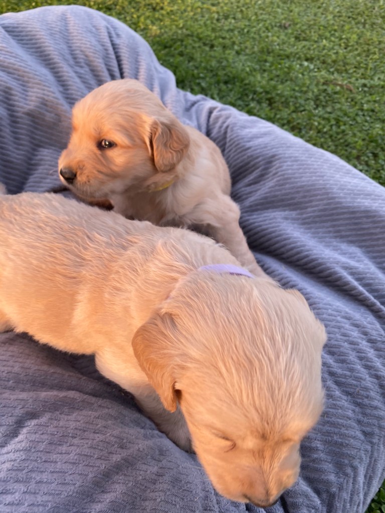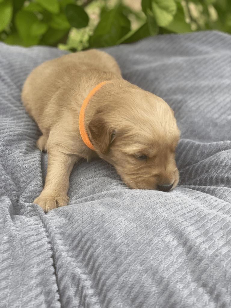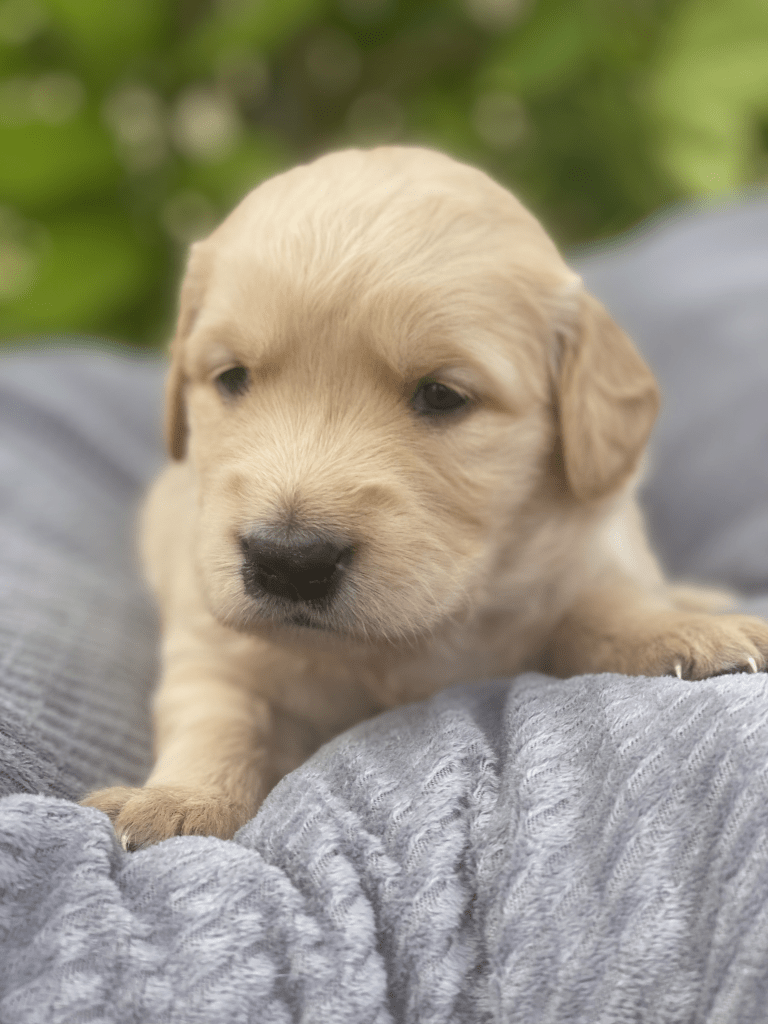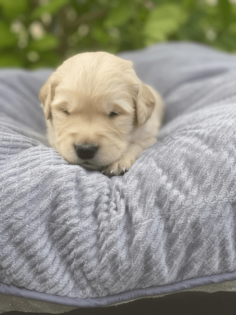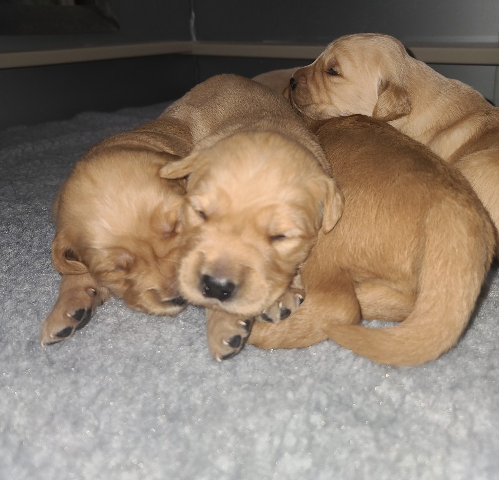 Pups are starting to get big, starting to show more color (Golden Puppies will usually match the color of their ears when they fully mature), and their eyes are just starting to open. Personalities are starting to show more (talking a lot more), and they are learning to walk. All very exciting, and on track for their development.
