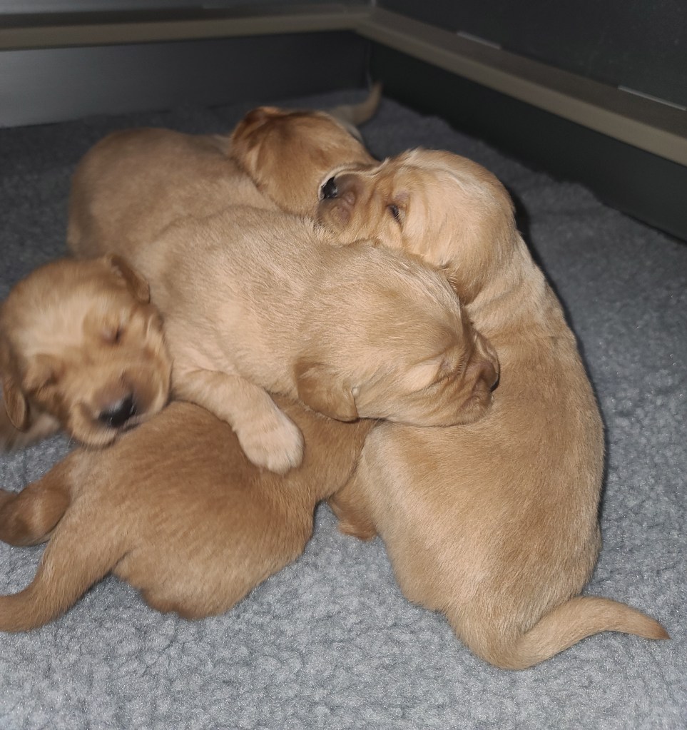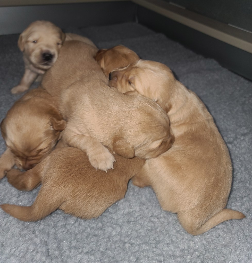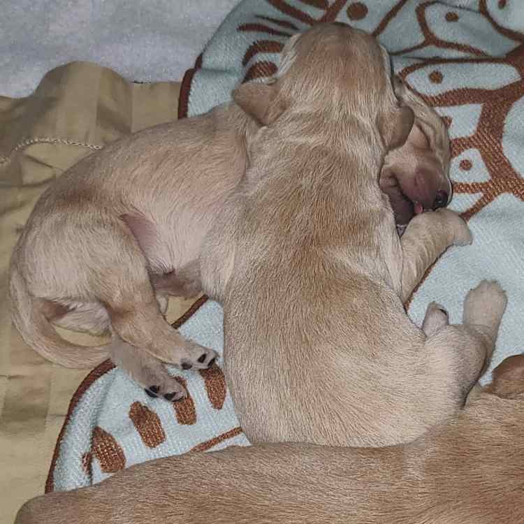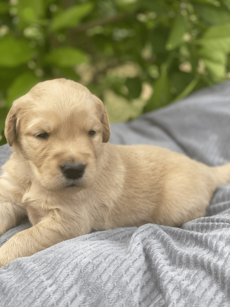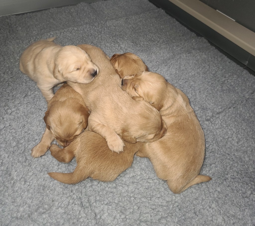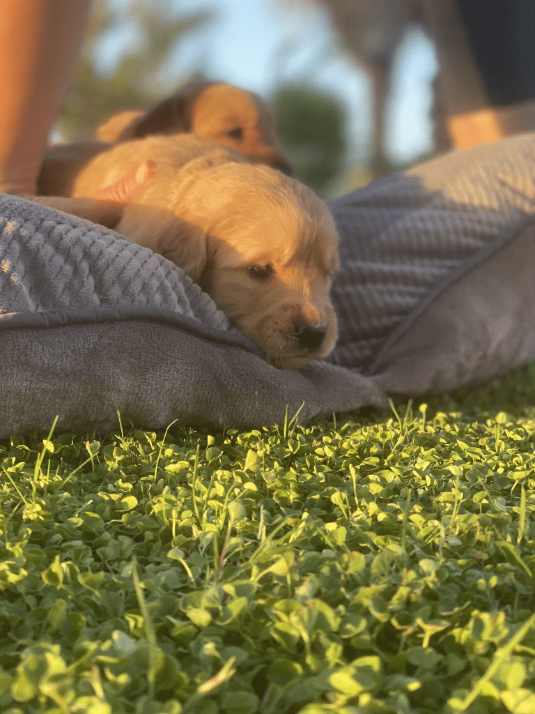 Pups are starting to get big, starting to show more color (Golden Puppies will usually match the color of their ears when they fully mature), and their eyes are just starting to open. Personalities are starting to show more (talking a lot more), and they are learning to walk. All very exciting, and on track for their development.